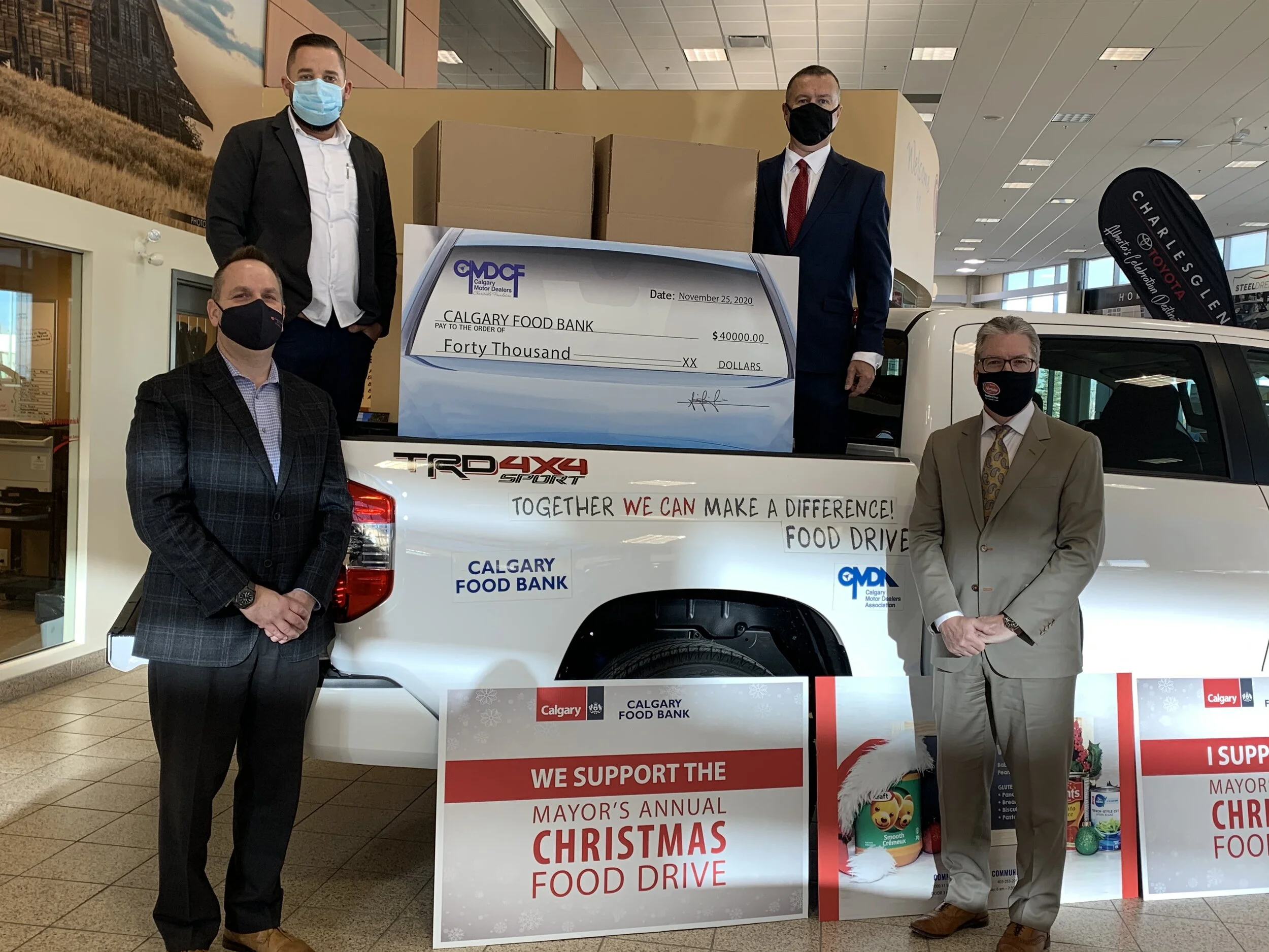 Our 12 Days of Giving is just the beginning! We’re kicking off the Mayor’s annual Christmas food drive with a cheque for $40,000.00 from the Calgary Motor Dealer Charitable Foundation and we’d like to invite you to join us in giving to this worthy cause.